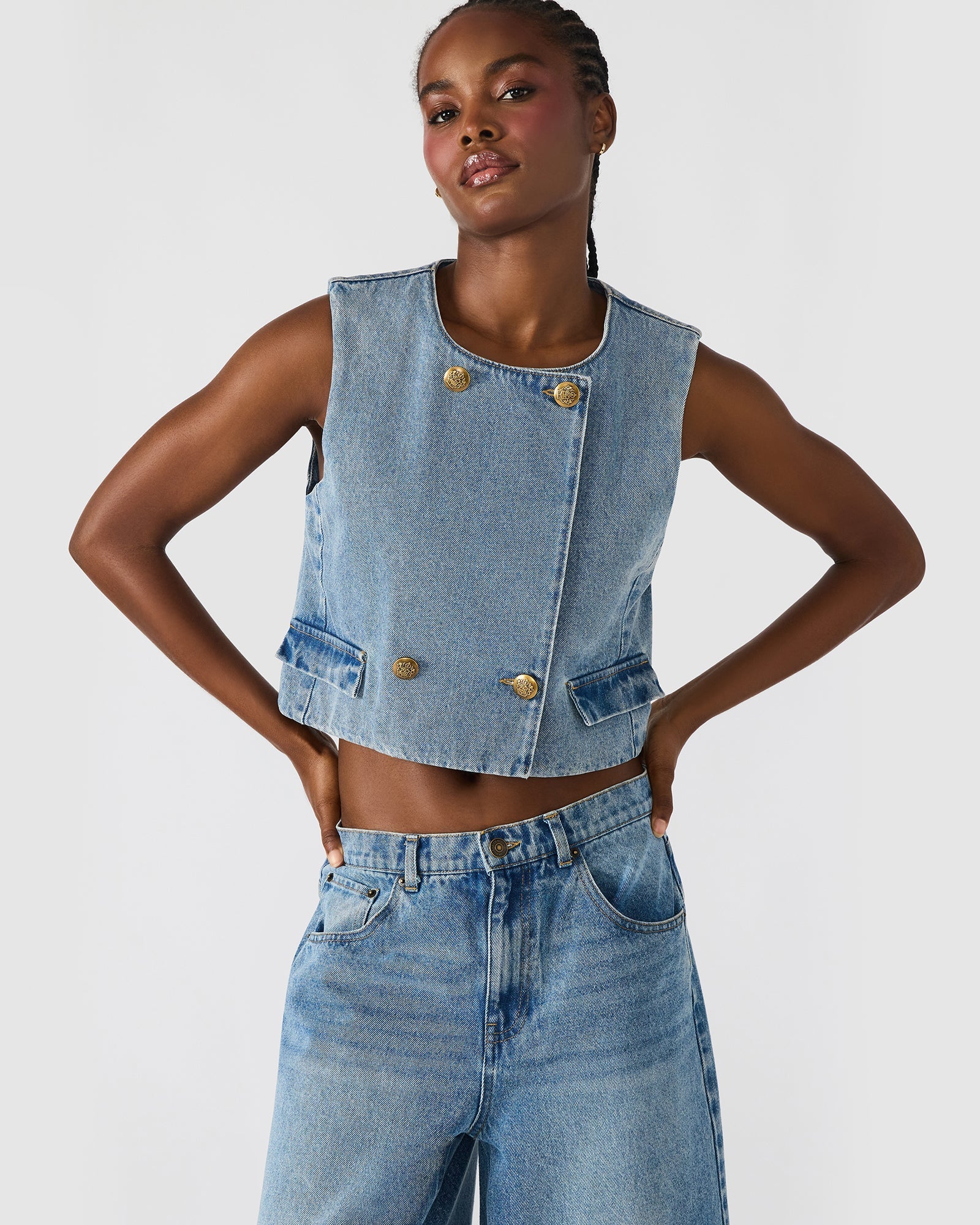 This BREA vest top is crafted from premium denim. featuring precise button details and a secure button closure for a polished finish. Designed as part of a matching set. this vest top offers versatile layering options. combining classic style with modern edge for a refined. expert look.